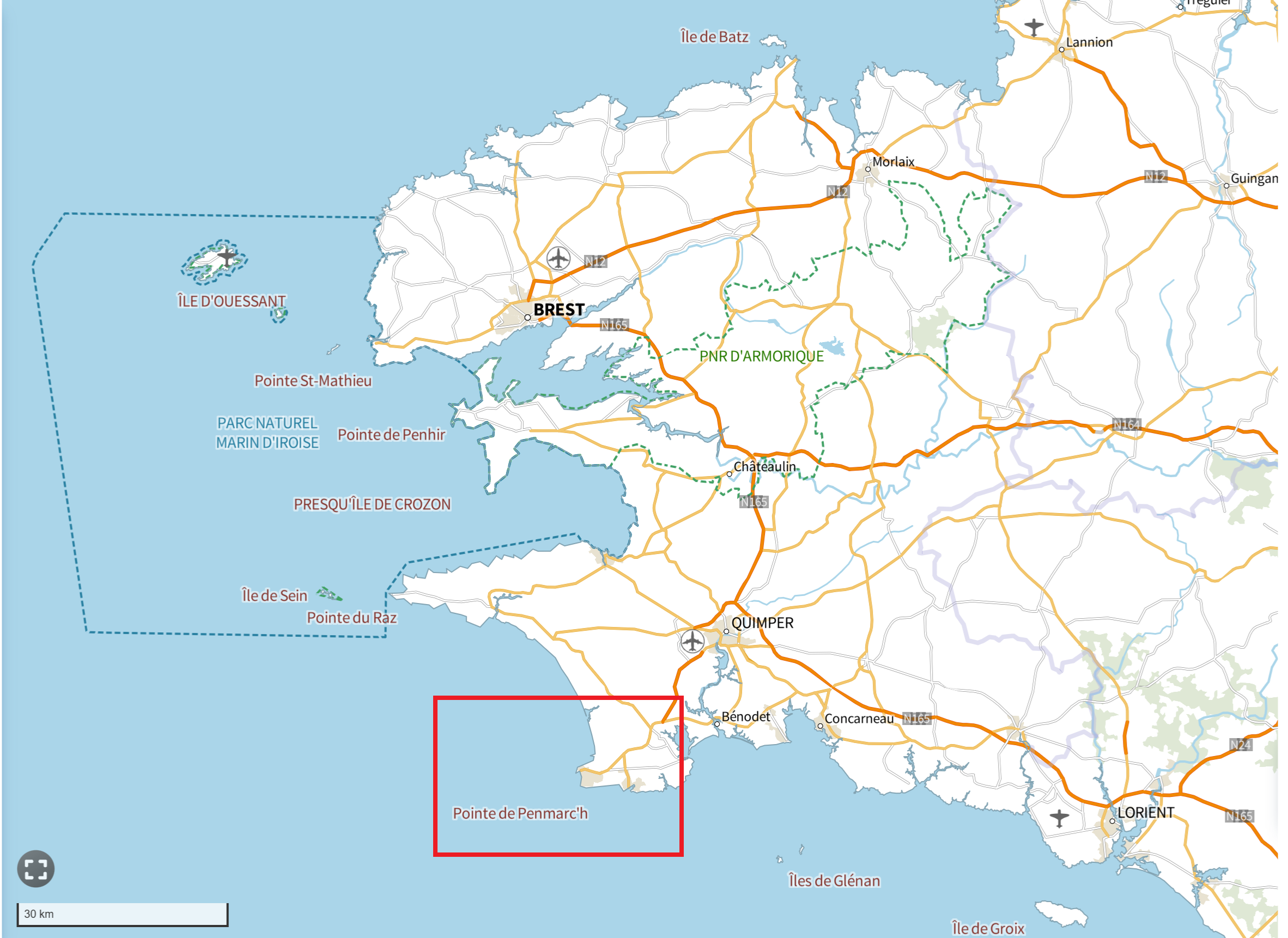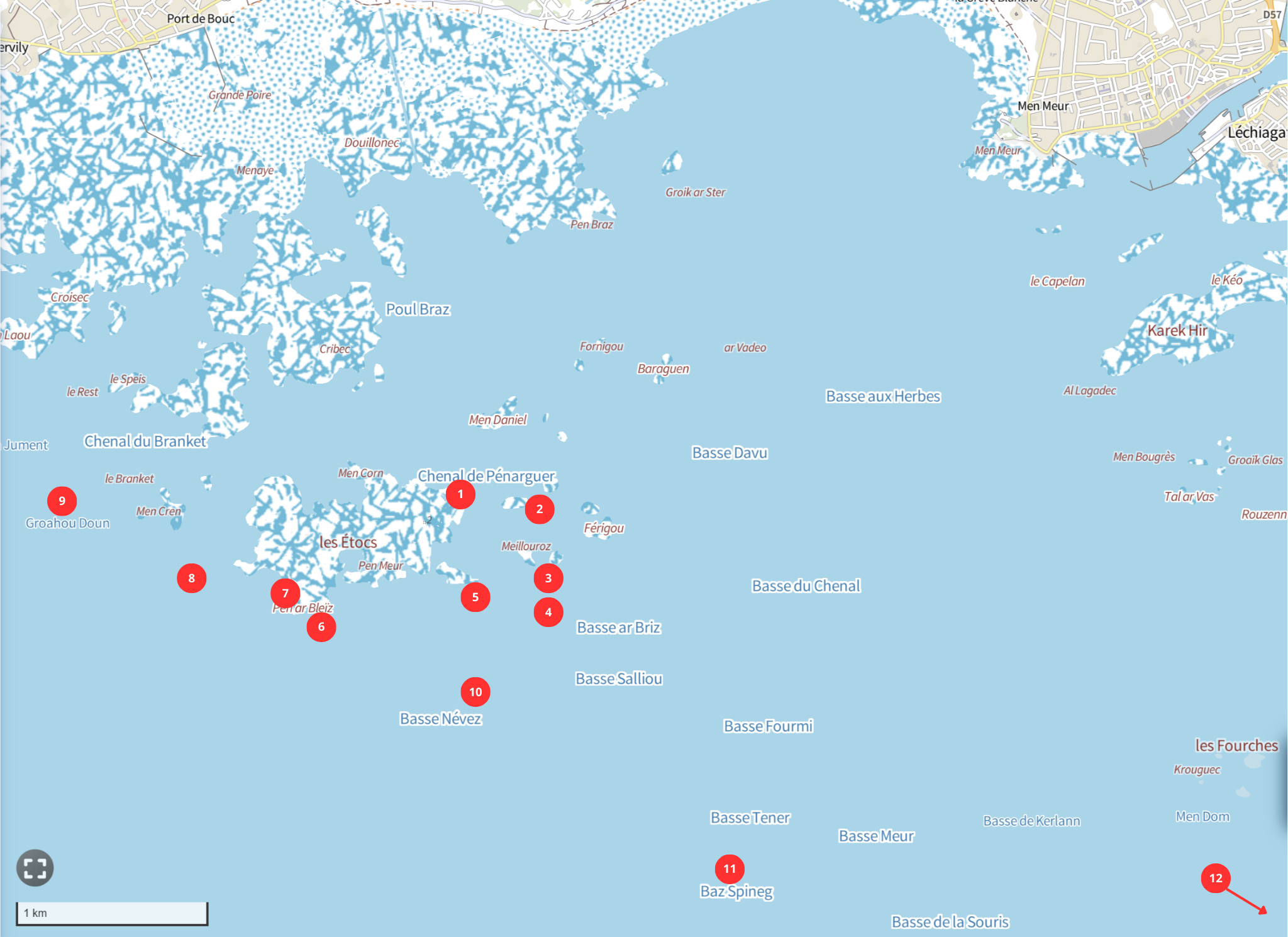 Un des sites les plus spectaculaires des Etocs, au sud-ouest un tombant pratiquement vertical et dégringolant jusqu’à -30 m, vers l’est c’est une dorsale parsemée de failles accessible à tous les niveaux de plongeurs si le courant n’est pas trop fort. Lieux, bars et autres chasseurs fréquentent ce site particulièrement oxygéné. Comme tous les autres sites la faune fixée recouvre les parois de cette basse. Un large couloir d’une profondeur de – 30 m sépare ce site de celui d’Ar Bleiz, réservé aux plus aguerris.
